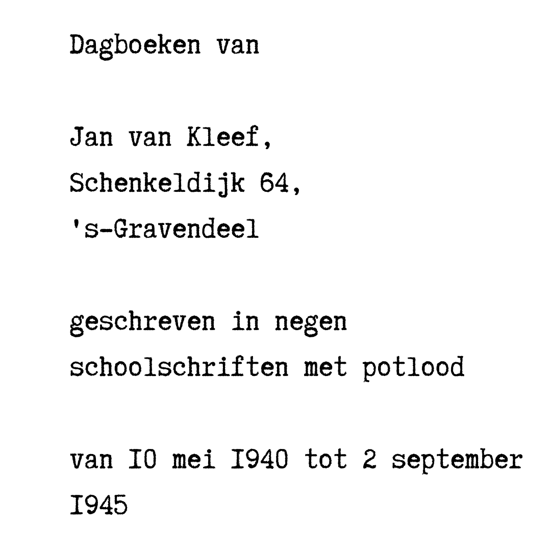 Jan van Kleef (Schenkeldijk 64, ‘s-Gravendeel) schreef in de periode van 10 mei 1940 tot 2 september 1945 in negen schoolschriften met potlood nauwgezet over de gebeurtenissen.